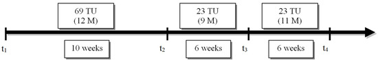 Schematic representation of the study design. Summarization of training units (TU) and number of matches (M) during the pre-season period (t1–t2), first half of the competitive period (t2–t3) and second half of the competitive period (t3–t4).