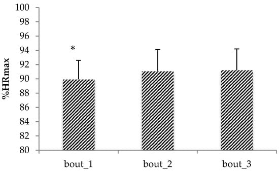 Mean ± SD of %HRmax across bouts combining both two vs. two and four vs. four. * indicates a significant difference (adjusted p value (adj-p) = 0.043) between first and second bout.