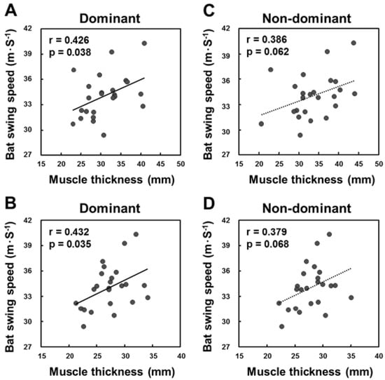 Muscle thickness of the upper and lower limbs did not statistically significantly correlate with BSS in the present study (Table 2). However, the relationship between BSS and muscle strength of the upper and lower limbs seems to vary depending on their maturity in strength and bat swing skill. Previous studies have found statistically significant correlations between BSS and muscle strength of the upper and lower limbs in high school baseball players [,], whereas collegiate baseball players have shown inconsistent results regarding the correlation between BSS and upper and lower limb muscle strength []. The findings of the present study suggest that muscle thickness of the upper and lower limbs does not correlate with BSS. In previous studies, resistance training emphasizing the upper and lower limbs effectively increased BSS in high school baseball players but not in collegiate baseball players [,]. Such difference between high school and collegiate players can be explained by the higher trainability of high school players because of their less developed muscle strength and BSS. In a previous study of high school baseball players, Miyaguchi and colleagues [] reported a statistically significant correlation between the bat swing velocity and maximum load for bench press with one repetition in a group of players who had hit a home run in their league. In contrast, they also found no correlation between the bat swing velocity and maximum load for bench press with one repetition in a group of players who had never hit a home run. Based on these studies, improvement in muscle strength of the whole body, including the upper and lower limbs, may be crucial to improve swing mechanics and BSS in poorly-trained hitters. On the other hand, improvement in only the trunk muscles, which are responsible for trunk rotation, could effectively increase BSS in well-trained hitters. In fact, in a previous study, a training protocol including maximum trunk rotation with a bat swing–like posture successfully increased bat swing velocity in collegiate baseball players []. Therefore, the hitter’s strength level, specificity of training for baseball hitting, and BSS should be considered in designing an effective training program for improving the muscle strength of the upper and lower limbs.