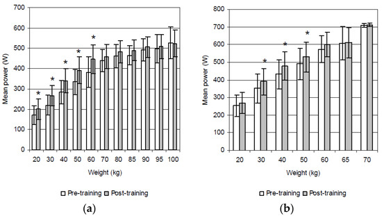 p ≤ 0.05), the differences between mean values of power before and after training were compared by a one-tailed Student’s