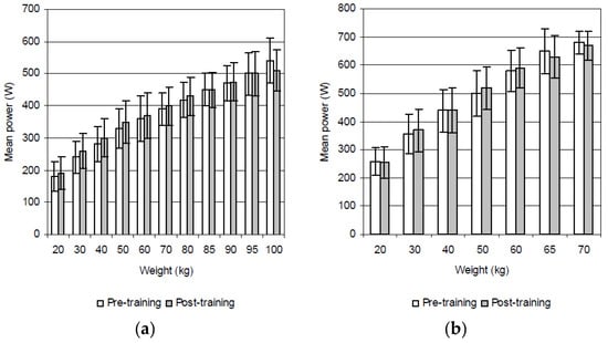 14]. Following the resistance training, mean power during the deadlift increased significantly at 20 kg (14.3%), 30 kg (17.7%), 40 kg (16.5%), 50 kg (14.5%), and 60 kg (14.3%). These values increased significantly also during the deadlift high pull at 30 kg (9.9%), 40 kg (10.1%), and 50 kg (8.2%). Enhancement of power outputs during these exercises may be attributed to the applied training consisting of ground-based free-weight exercises in addition to exercises on strength-training machines. The activation of the muscles that function as stabilizers was greater during free-weight than fixed-form training [