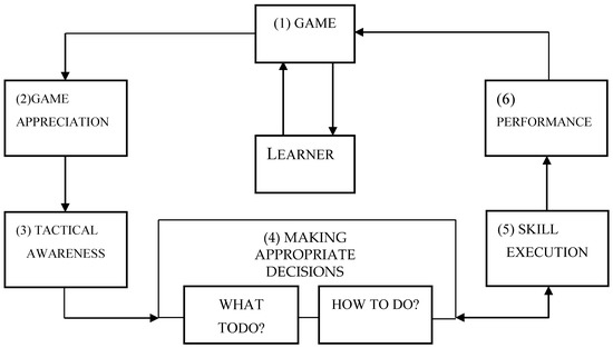 TGfU evolved as a practical application of a six-step learning model, as illustrated in Figure 1, practised at Loughborough University in the late 1960s [5,39].Today, TGfU is a frequently pursued non-linear game-learning model compared to linear and structured skills-led models [13,30,40]. The original TGfU model is still relevant with some slight adjustment in terms of providing students with cue perception and skill drills, as suggested in the revised version of TGfU proposed by Kirk and MacPhail [40], as this model caters to a product and process curriculum approach. The traditionally linear and structural model of skill-led pedagogy used structured lessons focusing on skill development and dominated by the coach or teacher [21,33]. The skill-led structural or linear model emphasizes skills development and technical enhancement before players undertake authentic game play [26,41,42]. This approach gives due importance to skill development compared to tactical thinking and tactical game play [43,44]. Even though the skill based-led model seems to be less effective and outdated compared to game-based approaches such as TGfU, the skill-based model still seems to be strong in some countries. Anecdotal evidence indicates that cultural and situated learning perspectives of coaches in Malaysia and India seem to hold as the central tenet that the coach is central, playing important roles such providing a respected role model, cues and feedbacks.