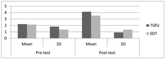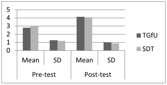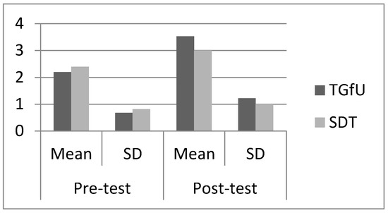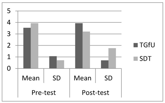 Pre-test results indicated there was no significant difference between the TGfU (2.20 ± 1.81) and SDT approaches (2.13 ± 1.35) for adjust, F(1,28) = 0.013, p > 0.05 among Malaysian players. For post-12 test results, there was also no significant difference between TGfU (4.13 ± 0.91) and SDT (3.53 ± 1.35), F(1,28) = 2.02, p < 0.05 for adjust. Figure 3 illustrates the mean and SD pre-test and post-test results for adjust among Malaysian players.