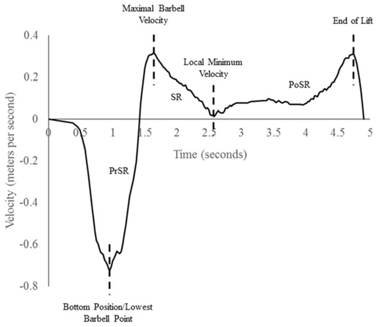Example velocity curve for a bench press exercise indicating the pre-sticking region (PrSR), sticking region (SR), and post-sticking region (PoSR).