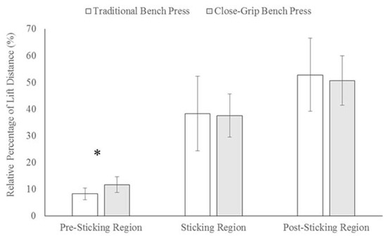 Distances of the pre-sticking region, sticking region, and post-sticking region relative to lift distance in a maximal traditional and close-grip bench press in resistance-trained men and women (n = 27); * Significant (p < 0.01) difference between the CGBP and the TBP.