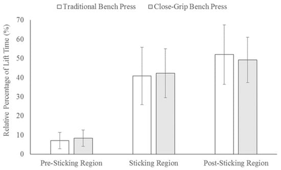 Durations of the pre-sticking region, sticking region, and post-sticking region relative to lift duration in a maximal traditional and close-grip bench press in resistance-trained men and women (n = 27).