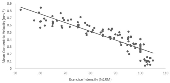 Trend of mean concentric velocity for increasing exercise intensity.