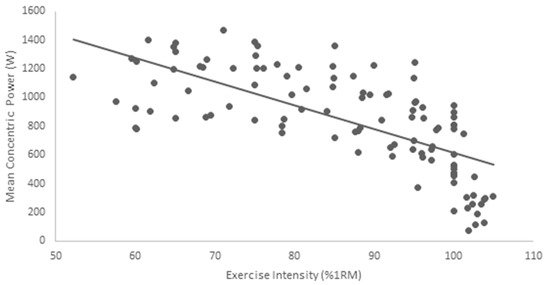 Inter-subject MCV and mean power of each load condition, standard deviations (SD), and between-subject coefficient of variation (CV) were calculated for each load condition. To assess the relationship between movement velocity and relative intensity in the back squat, a Pearson product-moment zero-order correlation was performed between the MCV, mean power, and the back-calculated relative intensities for warm-up loads. These data were analyzed using Microsoft ExcelTM 2010, (Version 2010, Redmond, WA, USA).