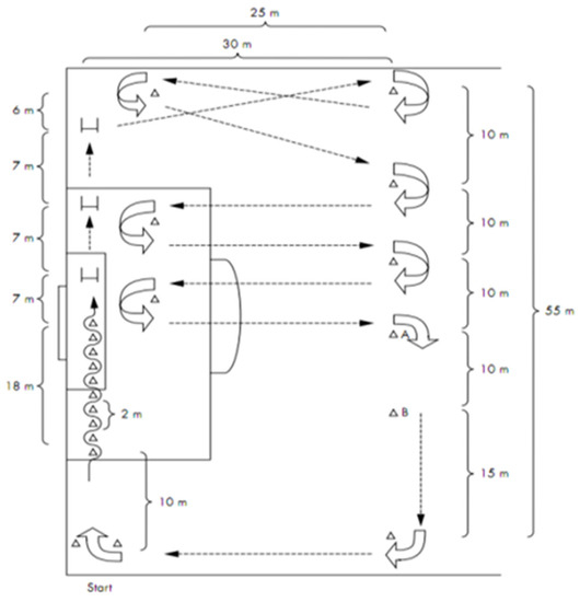 The procedure of this test is described in detail elsewhere [19]. Briefly, according to Figure 1, from the start point, players dribbled through the first 10 cones, then jumped three 30-cm height cones, then dribbled through 8 cones as fast as possible toward point A. Athletes then run backwards from point A to point B, and after point B players run forward again to the starting point. Each athlete has 10 min to complete as many laps as possible. Total distance (m) and estimated VO2max were measured as markers of specific endurance of soccer players, regarding previously described [19,20]. Players are to dribble the ball during the test. During the test, subjects were encouraged to perform at maximal effort.