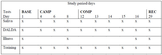 The experimental approach of this study was a repeated measures design, where all athletes engaged in 4-weeks of training and competition, with weekly modifications of training load. Resting morning saliva samples were collected within one hour of awakening, before a training camp (BASE) and during a training camp (3 measurements; CAMP), during an international competition (5 measurements; COMP), and two weeks post competition (REC) (Figure 1).