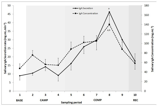 Mean ± SEM (n = 10) for salivary IgA secretion and concentration during baseline, training camp, competition, and post-competition testing periods; a denotes significant difference from recovery (p < 0.05); b denotes significant difference from camp (p < 0.05).