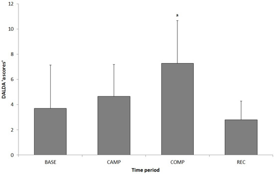 Mean ± SD (n = 10) for Daily Analysis of Life Demands of Athletes (DALDA) ‘a scores’ during BASE, CAMP, COMP, and REC testing periods; a denotes significant difference from REC (p < 0.05).