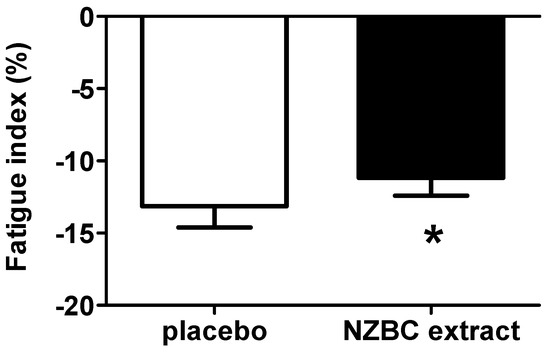 Fatigue index of the running anaerobic sprint test for trained youth and recreationally active football players for the placebo and New Zealand blackcurrant (NZBC) extract condition. * Denotes a strong trend for a difference between placebo and New Zealand blackcurrant extract (p = 0.06).
