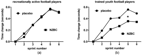 Change in sprint time from sprint 1 to subsequent sprints in recreationally active (a) and trained youth football players (b) following 7 days of New Zealand blackcurrant extract. * Denotes difference between placebo and New Zealand blackcurrant extract (p < 0.05). Data are mean values.