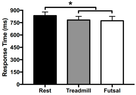 Mean response time (RT) during Stroop task performance after seated rest, treadmill exercise, and futsal. Error bars represent SEM. * Significant difference at p < 0.05.