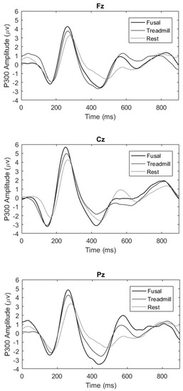 Mean P300 amplitudes from the Fz (top panel), Cz (middle panel), and Pz (lower panel) electrode sites during Stroop performance after seated rest (light grey), treadmill exercise (dark grey), and futsal (black).