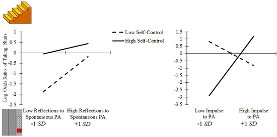 Figure 1). Low and high self-control are relative to the sample. In the figure, this is represented as −1 SD and +1 SD relative to M. Specifically, participants with high self-control who had a high impulse toward physical activity were more likely to take the stairs than their counterparts with a low impulse toward physical activity, whereas the opposite was the case for participants with low self-control. Notably, the results did not change in terms of statistical significance when adding impulse toward sedentary behavior or the impulse toward sedentary behavior × self-control interaction to the model (reflections toward spontaneous physical activity: odds ratio = 1.68,