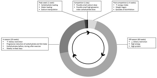 Doughnut chart representation of the stages of bodybuilding preparation, including key dietary strategies used, as reported by seven male, competitive natural bodybuilders participating in in-depth interviews. Duration of stages are approximate and vary between bodybuilders.