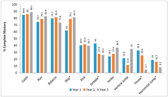 Percentage mastery of fundamental movement skills (FMS) by school year group. * p ≤ 0.05.