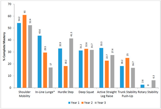 Percentage mastery of the Functional Movement Screen (FMS™) by school year group. * p ≤ 0.05.