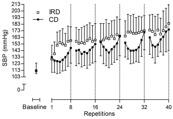 Hemodynamic values before exercise were not significantly different between protocols for all variables (p > 0.05). Regarding SBP responses (Table 1), for the mean of the SBP peaks of the 40 repetitions there was a significant interaction between session and time (p = 0.018), such that both (p < 0.001) IRD and CD were higher during the sessions in comparison with the baselines, and SBP values during the IRD were higher than the values during the CD (p = 0.013). There was no main effect of the session (p = 0.052), and a main effect of time was reported (p < 0.001), with higher values during exercise compared with its baseline values. The progression of the SBP peaks during the 40 repetitions is descriptively reported in Figure 2.
