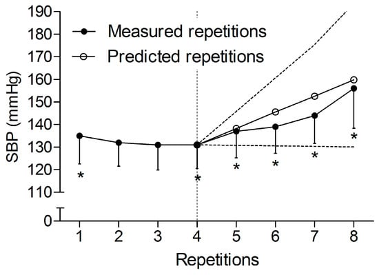 Lineal mixed model analysis of the systolic blood pressure (SBP) peaks during the fourth last repetitions of the first set of the continuous design, once the v-shape was surpassed. Black circles refer to the SBP peaks measured during the first set of the continuous design. White circles refer to the predicted SBP peaks for the fourth last repetitions. Black dashes refer to the extreme tendencies considering the estimated individual variability in the increase (slope) of SBP peaks for the fourth last repetitions. * Significantly different versus baseline values (p < 0.05). Data are displayed as means ± 95% confidence intervals (n = 12).