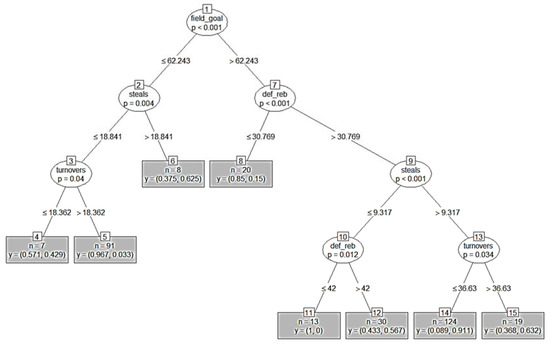 On the right-hand side of the tree, Node Number 7 separated the data based on “defensive rebounds” and generated Terminal Node 8, while Node Number 9 further separated the data based on “steals” to generate Nodes 10 and 13. Finally, Nodes 10 and 13 split the data based upon by “defensive rebounds” and “turnovers,” respectively. The combination of “field-goal percentage” (>62.243%), “defensive rebounds” (>30.789), “steals” (>9.317), and “turnovers” (<36.63) provided the greatest probability of winning (91.1%, Terminal Node 14).