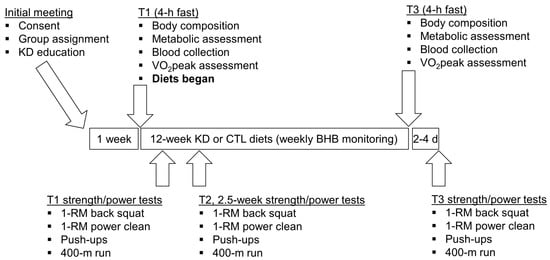 Study design. This figure depicts the 12-week dietary intervention. Notably, all participants continued their normal workout routine at the local CrossFit training facility during the study. Abbreviations: KD, ketogenic diet; CTL, control diet; 1-RM, one repetition maximum.