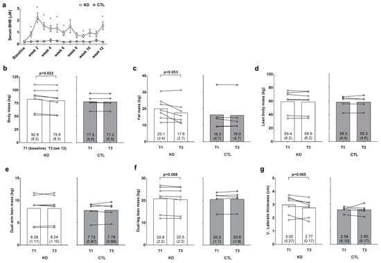 Blood BHB levels were 2.8–9.5-fold higher in KD versus CTL throughout the intervention confirming a state of nutritional ketosis in the KD group. In addition, independent samples t-tests indicated that humoral BHB levels were significantly greater (p < 0.05) in the KD group at weeks 1–6, 9 and 12 (Figure 2a). A main time effect (T1 > T3; p = 0.020) and large effect for the group × time interaction was observed for change in body mass between groups (p = 0.053, ηp2 = 0.325; Figure 2b); notably a significant decrease from T1 within the KD group was observed (p = 0.022). Additionally, a main time effect approached significance (T1 > T3; p = 0.051), and a large effect for the group × time interaction was observed for change in DXA fat mass between groups (p = 0.126, ηp2 = 0.218; Figure 2c); notably, the decrease from T1 within the KD group approached significance (p = 0.053). There was no main time effect (p = 0.521) or group × time interaction observed for DXA lean body mass (p = 0.534, ηp2 = 0.040; Figure 2d). There was no main time effect (p = 0.876) or group × time interaction observed dual-arm DXA lean mass (p = 0.742, ηp2 = 0.011; Figure 2e). There was no main time effect for dual-leg DXA lean mass (p = 0.344), although a large effect for the group × time interaction was observed (p = 0.111, ηp2 = 0.234; Figure 2f) whereby lower T3 values in the KD group approached significance (p = 0.068). Likewise, there was no main time effect for ultrasound derived vastus lateralis thickness (p = 0.159), although a large effect for the group × time interaction was observed (p = 0.180, ηp2 = 0.172; Figure 2e) whereby lower T3 values in the KD group approached significance (p = 0.065).