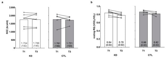 Effects of the intervention on resting energy expenditure and respiratory quotient values. Resting energy expenditure (REE) and resting respiratory quotient (RQ) values are presented in panels (a,b). Data are presented as group means accompanied by individual participant values, and means (±SE) values are indicated at the bottom portion of each bar. Abbreviations: KD, ketogenic diet; CTL, control diet; T1, baseline testing; T3, 12-week post-testing.