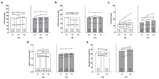 Effects of the intervention on strength, anaerobic, and aerobic performance metrics. One-repetition maximum (1-RM) squat, 1-RM power clean, maximum pushup repetitions, 400-m run time, and VO2peak values (assessed with a graded treadmill test and indirect calorimetry) are presented in panels (a–e). Data are presented as group means accompanied by individual participant values, and means (±SE) values are indicated at the bottom portion of each bar. Abbreviations: KD, ketogenic diet; CTL, control diet; T1, baseline testing; T2, 2.5-week testing; T3, 12-week post-testing.