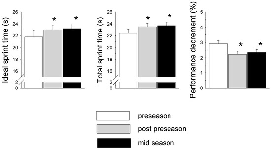 Changes in repeated sprint test (RST) indices of the soccer players throughout the different stages of the season (* p < 0.05 from preseason).