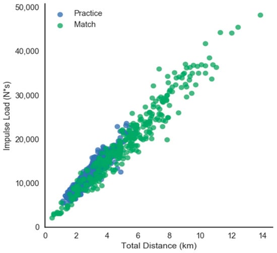 Several very large to nearly perfect correlations were found between Impulse Load and total distance (r = 0.95; p < 0.001), Impulse Load and sRPE (r = 0.84; p < 0.001), and total distance and sRPE (r = 0.82; p < 0.001). Figure 1 illustrates the relationship between Impulse Load and total distance.