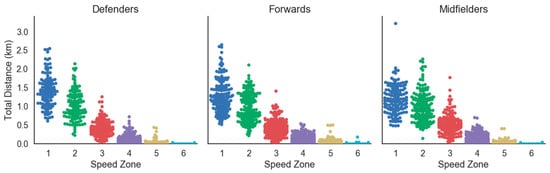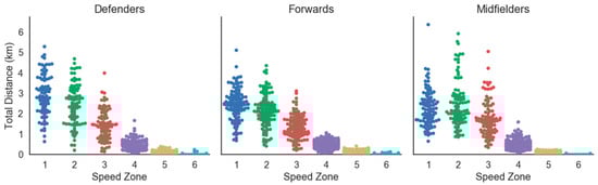 To our knowledge, this was the first study to assess accelerometry-based workloads in women’s college soccer as well as the first study to detail the demands of Division II women’s soccer match play. Previous research has investigated distance in speed zones and total distances. However, most of this research has focused on professional and national team levels, with limited research in women’s college soccer []. Collegiate soccer allows for unlimited substitutions, which differs from rules of professional and national team matches that only permit thee substitutions per match. One reason provided for the allowance of unlimited substitutions is due to the frequency of match play in college soccer. NCAA soccer teams generally play twice a week, and professional soccer teams often compete once a week []. As a result of different substitution rules, most starting players at the professional level must play the entire match, while college starting players have no such requirement. This difference in substitution patterns make it difficult to compare physiological and mechanical workloads among high level and collegiate play. Unlimited substitutions allow for large variances in match-to-match total distance, distance in speed zones, and total Impulse Load accumulated by each athlete. To demonstrate this, during match play (MP), mean time played was 45.32 ± 26.01 min, mean Impulse Load was 20,120 ± 8609 N·s, and mean total distance was 5.48 ± 2.35 km. Time played during match play ranged from 1.0–110.0 min, the highest and lowest Impulse Load during match play was 48,280 N·s and 4215 N·s, respectively, and total distance ranged from 1.09–13.85 km. Furthermore, Figure 2 and Figure 3 present swarm plots illustrating the distribution of distance in all speed zones by player position during matches and practice, respectively. This variability should be considered when quantifying the demands of women’s collegiate soccer.