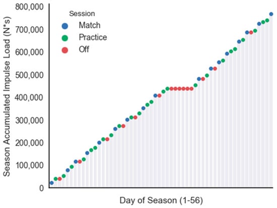 Unique to this study was that Hurricane Matthew struck the southeast coast of the United States during the middle of the regular season. Due to this major hurricane, a mandatory evacuation was issued that resulted in multiple match postponements and missed practices. Matches missed during this period were made up during the last two weeks of the regular season. Figure 4 displays the frequency of practices, matches, and days off, as well as the team mean accumulated Impulse Load throughout the 56-day regular season. No contact with the team occurred during the mandatory evacuation period (days 31–36). It can be seen that the frequency of matches and the rate of accumulating Impulse Load both increased during the second half of the regular season (days 37–56). During the first thirty days of the season, nine matches were played, with two to three days between matches. During the last 20 days of the season, eight matches were played, with only one to two days between matches. While injury data was not presented in this study, it is reasonable to assume that this situation may have resulted in higher levels of fatigue that may have negatively influenced injury risk and performance.