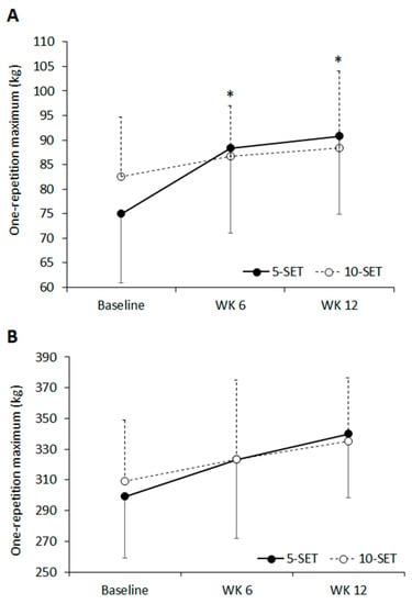 Upper and lower body muscle strength at baseline, six, and 12 weeks of training. One-repetition maximum at baseline, six weeks, and 12 weeks for the bench press (A) and leg press (B). Data are mean ± SD. * Significantly different to baseline for 5-SET group.