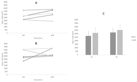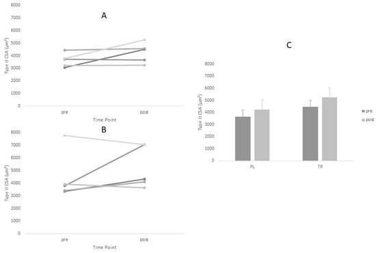 Changes in Type II cross-sectional area (CSA) for Treatment and Placebo Groups Pre and Post Intervention Period. (A) Treatment group; (B) placebo group; and (C) group means.