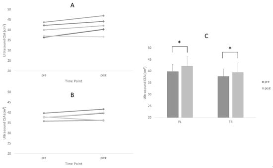 * = main time effect. Changes in Vastus Lateralis CSA for Treatment and Placebo Groups Pre and Post Intervention Period. (A) Treatment group; (B) placebo group; and (C) group means.