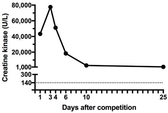 - Wagner, M.; LeNorman, D.; Dooley, A.; Rollins, L. Recurrent Rhabdomyolysis and Extreme Exercise—A Case Study. J. Sports Med. Allied Health Sci. 2015, 2, 3. [Google Scholar] [CrossRef]