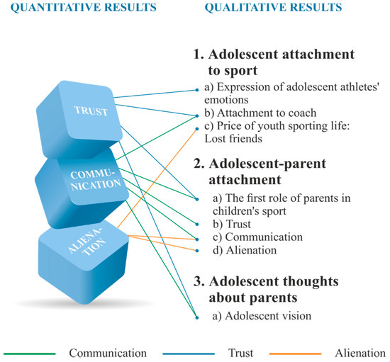 The purpose of this study was to examine the relationship between participation in youth sport and adolescent–parent attachment. Three factors were identified in the quantitative stage of the study namely, trust, communication, and alienation, which allow prediction of the attachment of adolescent athletes to their parents. Furthermore, a qualitative analysis was conducted to better understand the experience of athletes, to look at the study results in all aspects, and to paint a complete picture of the research. The overall results of the quantitative and qualitative stages were integrated in the scheme of the outcomes of the entire study (see Figure 1).
