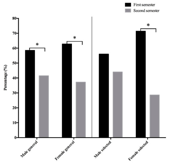 Figure 1 shows the distribution of the birth dates (semester of birth) from the players that took part in the national championship and also from those who were assessed in the present study. It was observed that there was a higher representation of players in the first half of the birth semester (H1) in comparison to second half of the birth semester (H2), which was statistically significant for all of the gender groups, except for the selected male players. However, Table 1 shows the expected frequency in the selected players following the distribution in Figure 1, where it was observed that there were only more female players than expected when compared with the distribution of the general players from Figure 1. However no statistically significant differences were found.