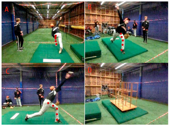 Kinematic data were collected with three high-speed video cameras (XL ZR 1000, Casio, Tokyo, Japan) at 240 Hz. The three cameras were placed approximately three meters from the pitcher to be able to film the entire pitcher from three different directions and to minimize projection errors (Figure 1). The first camera was placed behind the mound and directed towards the home plate, the second was placed sideways to the mound and the third was placed slant in front of the mound. After the setup of the cameras they were not repositioned anymore as their image was calibrated using a wooden reference frame of 1.9 × 1.35 m (visible in Figure 1D) to be able to perform 3D analyses. If one of the cameras was moved, a new calibration had to be performed. Before every pitch, a flashlight was used for synchronization of the video data of the three cameras. The ball speed (mph) reached during the pitches was measured from behind the home plate with a Stalker pro radar gun (Stalker Radar, Plano, TX, USA).