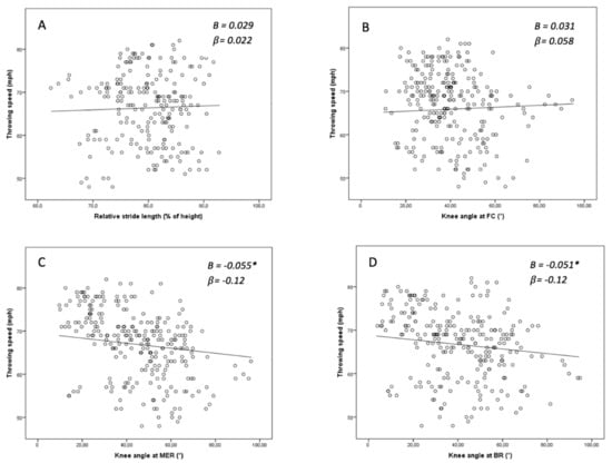 Scatterplots of observed values (including the repeated measures) of ball speed against stride length as percentage of body height (A), knee angle at foot contact (FC) (B), knee angle at maximal external rotation of the shoulder (MER) (C) and knee angle at ball release (BR) (D). Larger knee angles indicate more flexion. Regression lines are according to the adjusted regression coefficients using Generalized Estimating Equations (GEE) (see Table 1). B is the unstandardized coefficient. β is the standardized coefficient beta * p < 0.01.