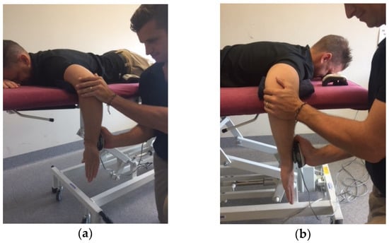 - Holt, K.L.; Raper, D.P.; Boettcher, C.E.; Waddington, G.S.; Drew, M.K. Hand-held dynamometry strength measures for internal and external rotation demonstrate superior reliability, lower minimal detectable change and higher correlation to isokinetic dynamometry than externally-fixed dynamometry of the shoulder. Phys. Ther. Sport 2016, 21, 75–81. [Google Scholar] [CrossRef] [PubMed]