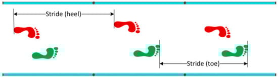 - Stride length is defined as the distance between the tip of two subsequent footprints of the same foot or the distance between the heel of two subsequent footprints of the same foot (measured in meters) (Figure 2).