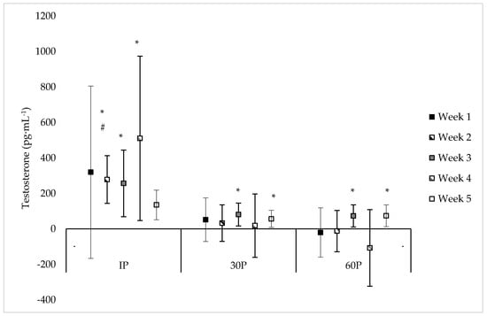 Neither a significant sex x time (F = 1.18, p = 0.318) or main effect for sex (F = 0.01, p = 0.923) were observed for T concentrations. However, a significant main effect for time was observed (F = 4.01, p < 0.001) where T concentrations were elevated from PRE-values at IP on WK2–WK5 (mean difference: 135–511 pg·mL−1, p ≤ 0.033), at 30P on WK3 (mean difference: 81.0 ± 30.1 pg·mL−1, p = 0.017) and WK5 (mean difference: 56.6 ± 22.7 pg·mL−1, p = 0.024), and at 60P on WK3 (mean difference: 73.5 ± 29.7 pg·mL−1, p = 0.023) and WK5 (mean difference: 74.3 ± 28.4 pg·mL−1, p = 0.021). On specific time points between weeks, T concentrations were significantly higher (p = 0.036) at IP on WK2 (487 ± 113 pg·mL−1) compared to WK5 (229 ± 49 pg·mL−1), and significantly higher (p = 0.023) at 30P on WK4 (318 ± 79 pg·mL−1) compared to WK5 (150 ± 29 pg·mL−1). Additionally, compared to WK5, trends were noted for higher T concentrations at PRE on WK3 (mean difference: 35.8 ± 19.1 pg·mL−1, p = 0.071), at IP on WK4 (mean difference: 580 ± 295 pg·mL−1, p = 0.064), and at 30P on WK2 (mean difference: 91.3 ± 52.2 pg·mL−1, p = 0.090). No other differences were found in T concentrations within or between each week. Individual values for T concentrations across each time point are presented in Table 3. Differences between post-exercise T concentrations and PRE-concentrations during each week of the CFO, as well as differences between weeks at specific time points, are illustrated in Figure 1.