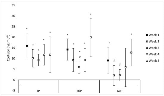Neither a significant sex x time (F = 1.07, p = 0.414) or main effect for sex (F = 0.96, p = 0.340) were observed for C concentrations. However, a significant main effect for time was observed (F = 10.13, p < 0.001) where C concentrations were elevated from PRE-values at IP on WK1–WK5 (mean difference: 9.3–15.9 ng·mL−1, p ≤ 0.011), at 30P on WK1–WK5 (mean difference: 6.0–19.9 ng·mL−1, p ≤ 0.002), and at 60P on WK1 (mean difference: 9.1 ± 3.011 ng·mL−1, p = 0.006) and WK5 (mean difference: 12.8 ± 2.9 ng·mL−1, p < 0.001). Compared to WK5, PRE-concentrations of C were significantly higher (p ≤ 0.017) on WK1–WK4 (mean difference: 4.7–7.6 ng·mL−1). At 30P, C concentrations were significantly higher (p = 0.004) on WK1 (24.1 ± 2.9 ng·mL−1) compared to WK3 (14.0 ± 1.7 ng·mL−1). Likewise, higher C concentrations were observed at 60P on WK1 (19 ± 3.1 ng·mL−1) compared to WK2 (11.8 ± 2.0 ng·mL−1) and WK3 (10.2 ± 1.2 ng·mL−1). Additionally, a trend was noted for higher C concentrations at IP on WK1 (25.8 ± 3.9 ng·mL−1) compared to WK3 (17.4 ± 2.0 ng·mL−1, p = 0.054). and WK5 (15.1 ± 4.3 ng·mL−1, p = 0.075), lower C concentrations at 30P on WK3 (14.0 ± 1.7 ng·mL−1) compared to WK4 (20.3 ± 3.2 ng·mL−1, p = 0.055) and WK5 (23.3 ± 4.5 ng·mL−1, p = 0.062), and lower (p = 0.084) C concentrations at 60P on WK3 (10.2 ± 1.2 ng·mL−1) compared to WK5 (16.2 ± 3.1 ng·mL−1). No other differences were found in C concentrations within or between each week. Individual values for C concentrations across each time point are presented in Table 4. Differences between post-exercise C concentrations and PRE-concentrations during each week of the CFO, as well as differences between weeks at specific time points, are illustrated in Figure 2.