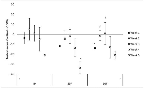 Mean changes in the testosterone-cortisol ratio during each week of the CrossFit® Open (mean difference ±95% Confidence Interval). * = Significantly (p < 0.05) different from PRE-scores. # = Significantly (p < 0.05) different from WK1. † = Significantly (p < 0.05) different from WK5.