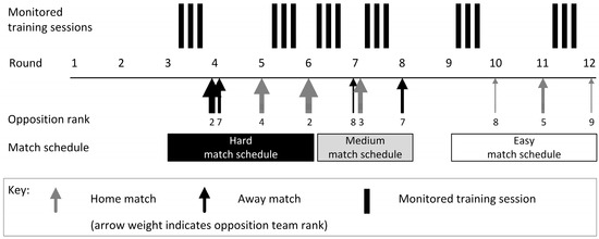 All players completed preliminary testing and were monitored over the course of a 17-round competitive basketball season. Six separate weeks of training data were collected during the competitive basketball season from three separate phases. Two weeks of training were monitored from each phase, where each week consisted of three team training sessions. The phases of monitored training were selected to represent periods of different match schedule difficulty, defined as easy, medium, and hard. The easy match schedule occurred between rounds 10 to 12, where the team played home matches against the two lowest ranked teams in the competition. The medium match schedule occurred between rounds 7 to 8, where the team played one double-header (i.e., two matches within a single round of competition) and one away match against moderately positioned teams. The hard match schedule occurred between rounds 4 to 6, where the team had an extensive travel schedule (away double-header) and a home match against the competition grand finalist (Figure 1).