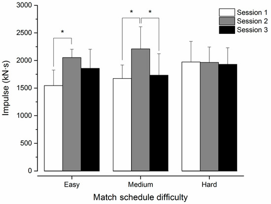 Exercise dose (Impulse) for easy, medium, and hard match schedules. Mean ± standard deviation. * Different between sessions (p < 0.05).